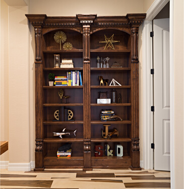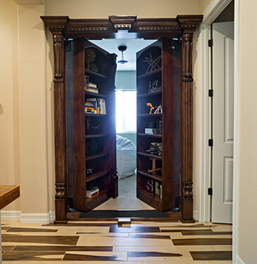 180 degree opening. Bookcase door opens inwards. Beautiful ornate carvings on wood.