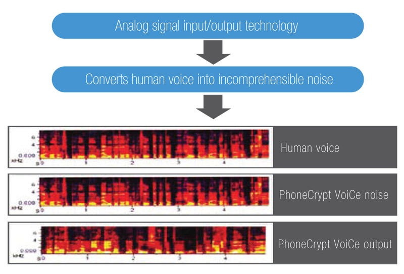 Feel safe everywhere with 100% secure phone conversations. PhoneCrypt VoiCe securely encrypts mobile phone conversations using military grade digital encryption synthesized with the caller’s biometric voice features and inaudible signals which create the strongest encryption possible. It is the first solution on the market that does not require the use of digital phone lines (3G, WiFi, CSD, GPRS, Internet) but instead uses the regular voice channel of the caller’s mobile network.